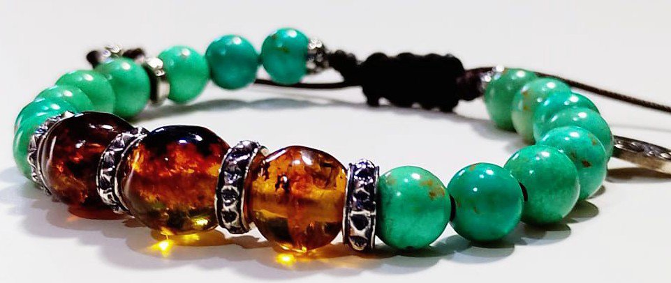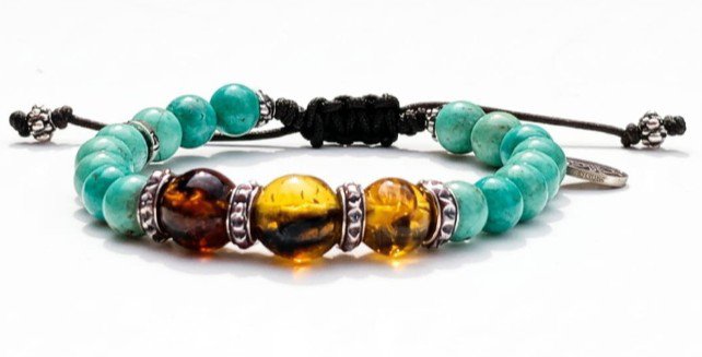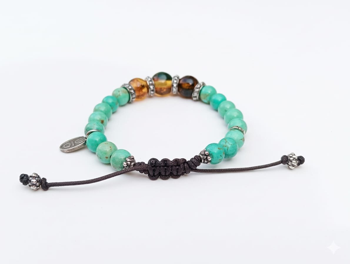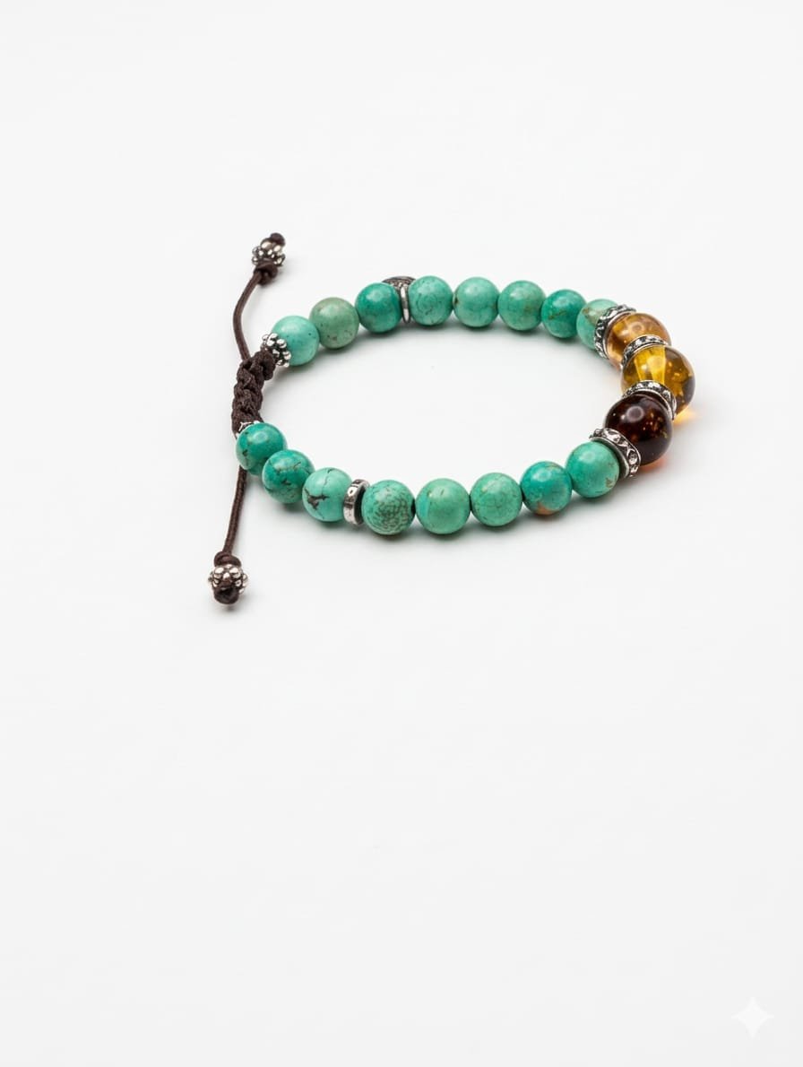 Fusiona la energía protectora de dos tesoros milenarios. La Turquesa, conocida como la piedra del cielo, actúa como un escudo contra las energías negativas y fomenta la comunicación clara. El Ámbar, resina fósil cargada con la vitalidad del sol, transmuta las cargas pesadas en alegría y bienestar.