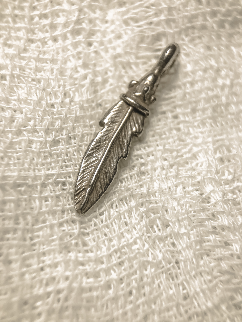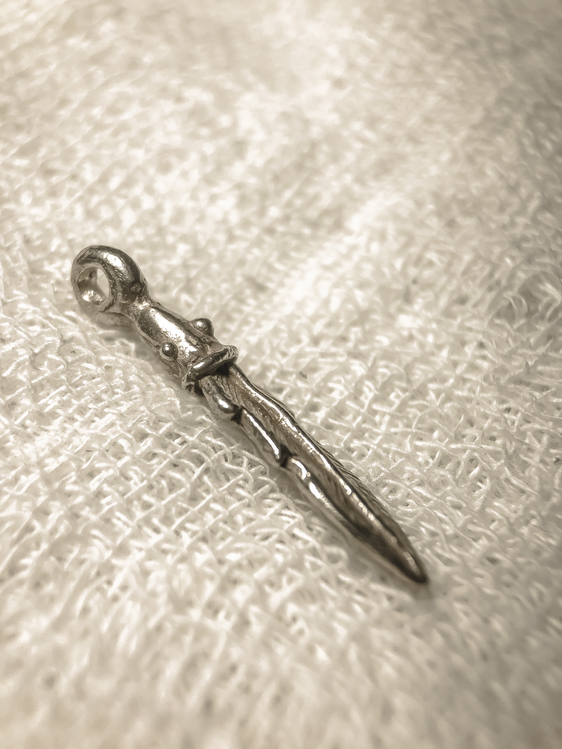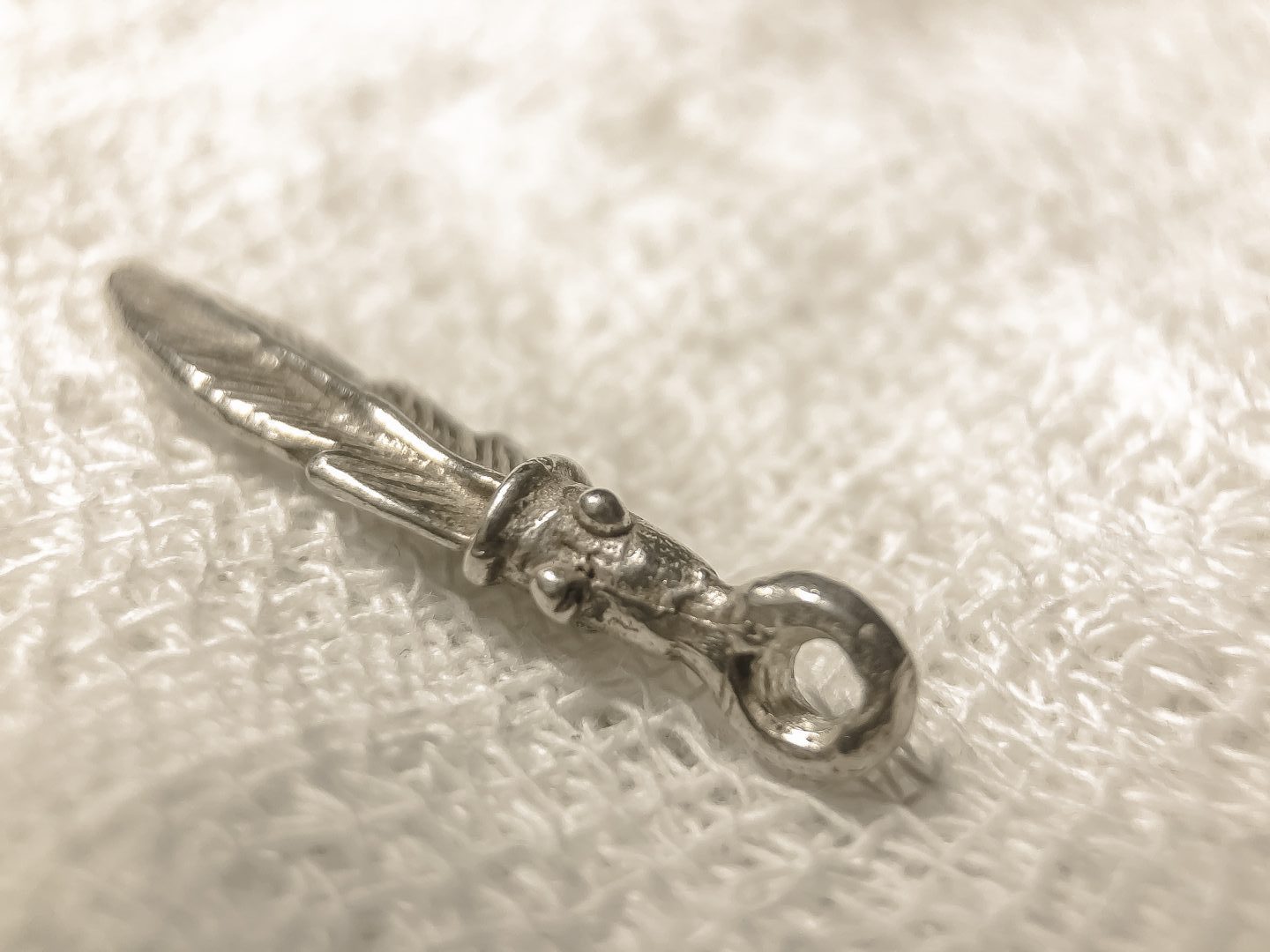 La pieza va completa en plata con una argolla de 2 mm. de diámetro sujeto al extremo de este. Detalle de pluma en una sola pieza.