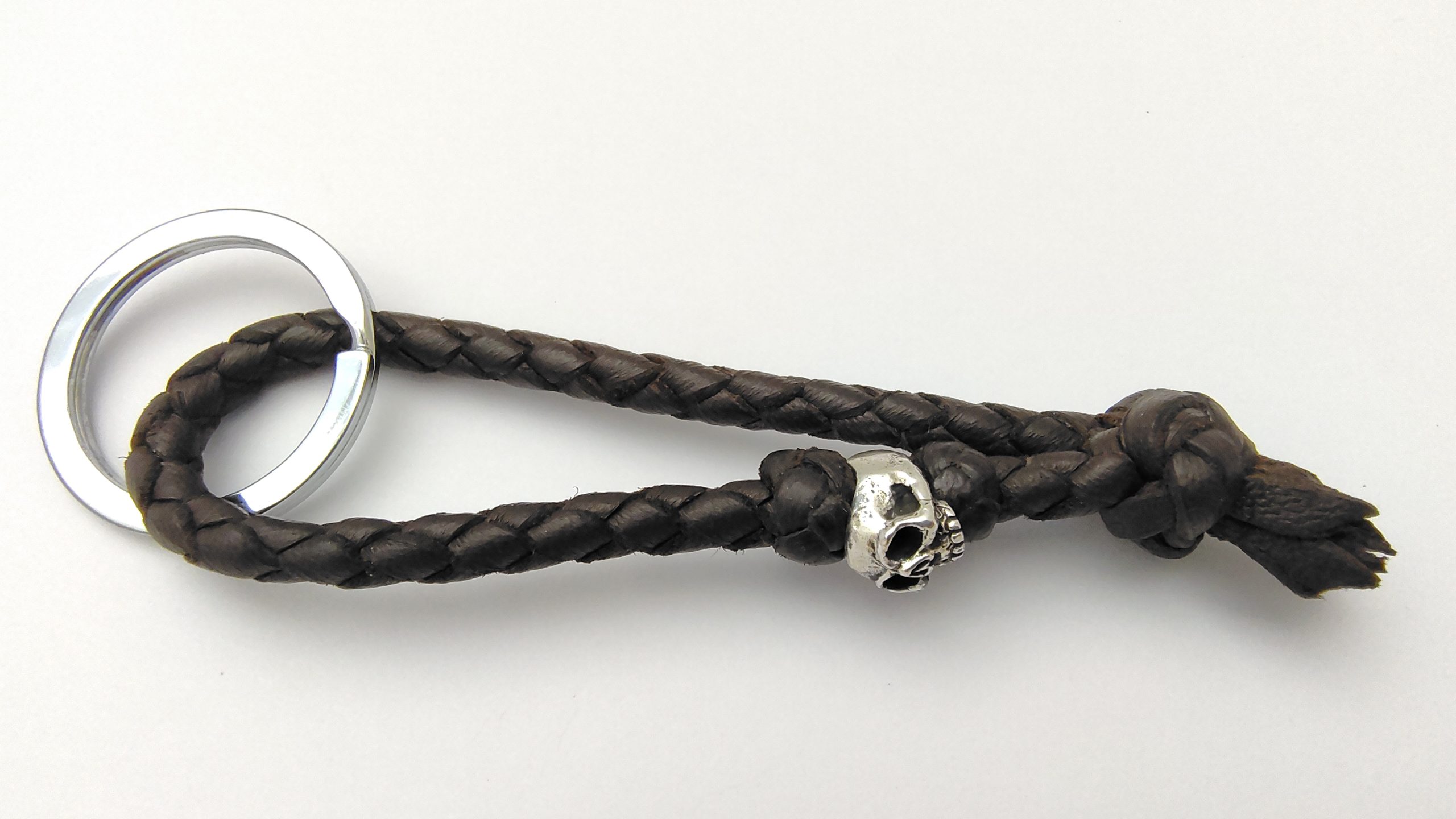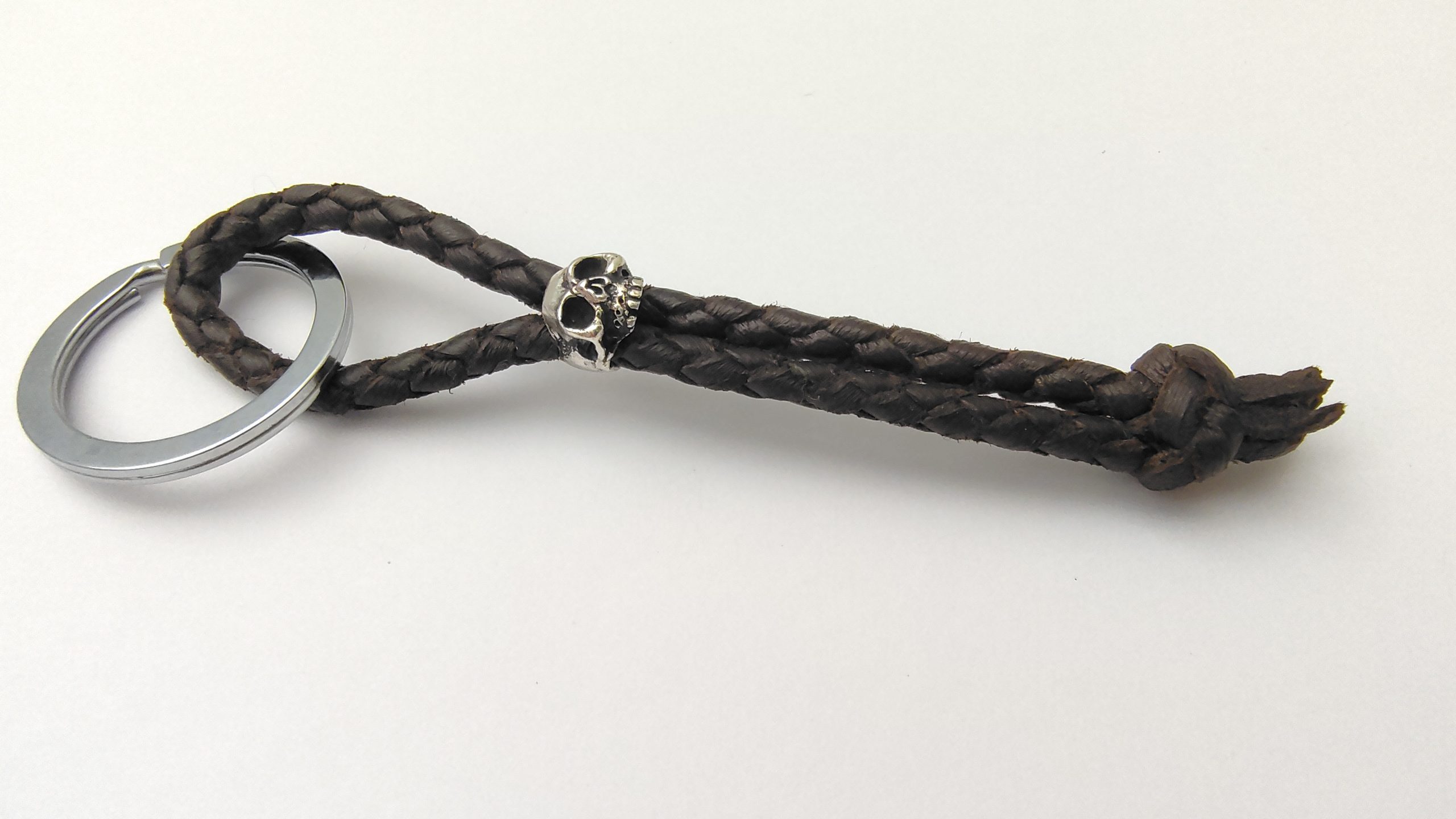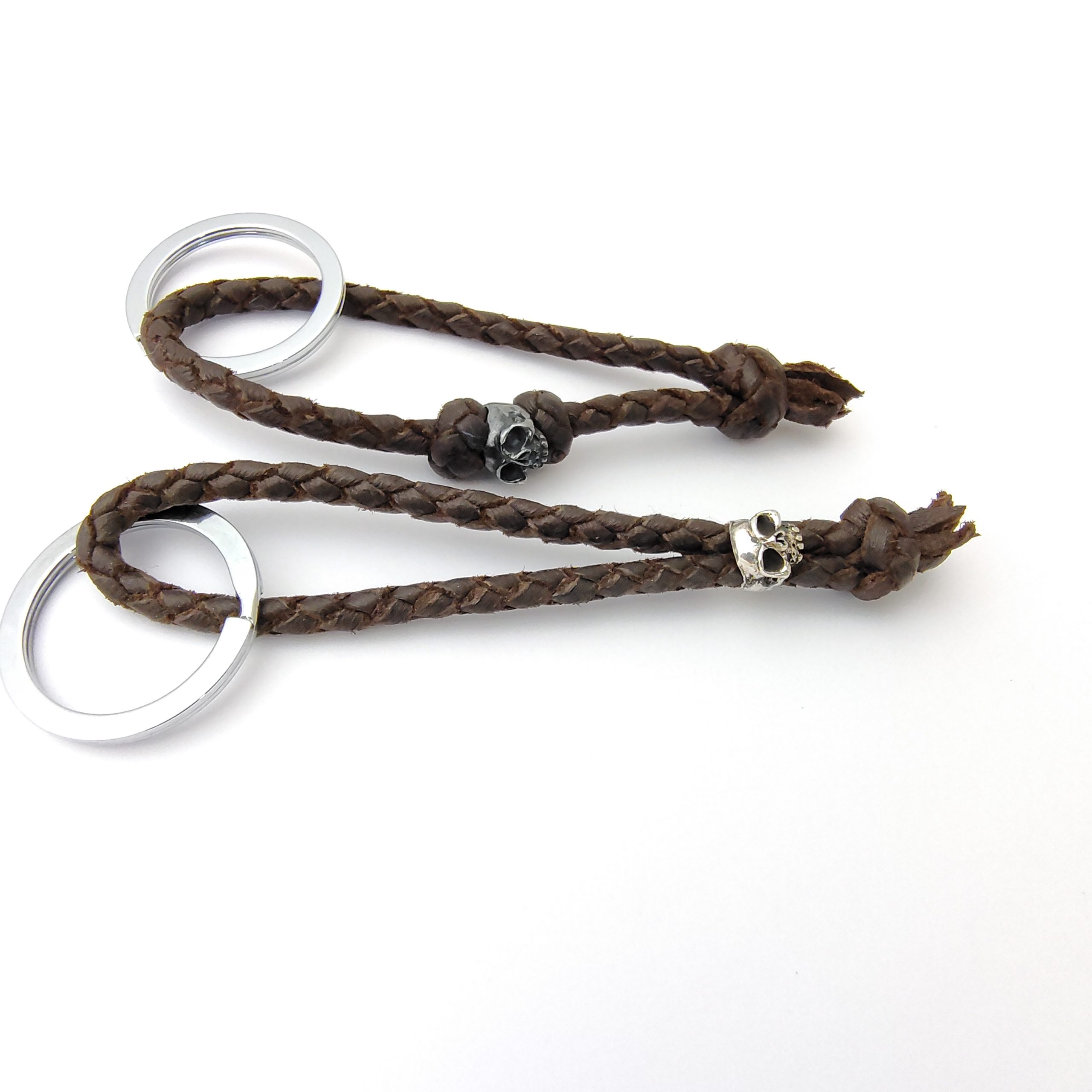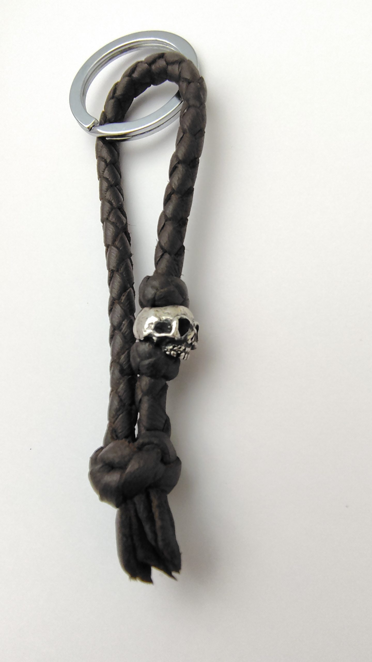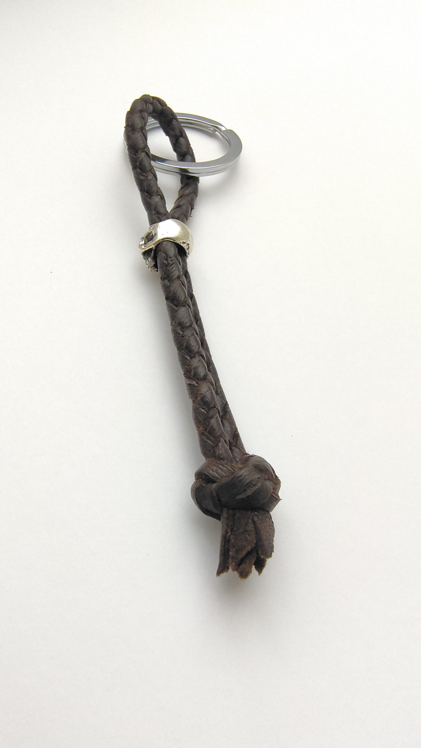 Este llavero es una obra de arte funcional que combina materiales nobles y diseño simbólico. Está elaborado con una correa de piel fina de cabra, cuya textura natural y trenzado artesanal evocan una conexión con lo terrenal y lo orgánico. En el centro de su diseño, una calavera de plata, disponible en acabado brillante o pavonado, actúa como una argolla corrediza, permitiendo ajustar el flujo y la forma del llavero según las necesidades. Los extremos están rematados con pequeños nudos de piel, que recuerdan semillas o núcleos, símbolos de potencialidad y conexión.