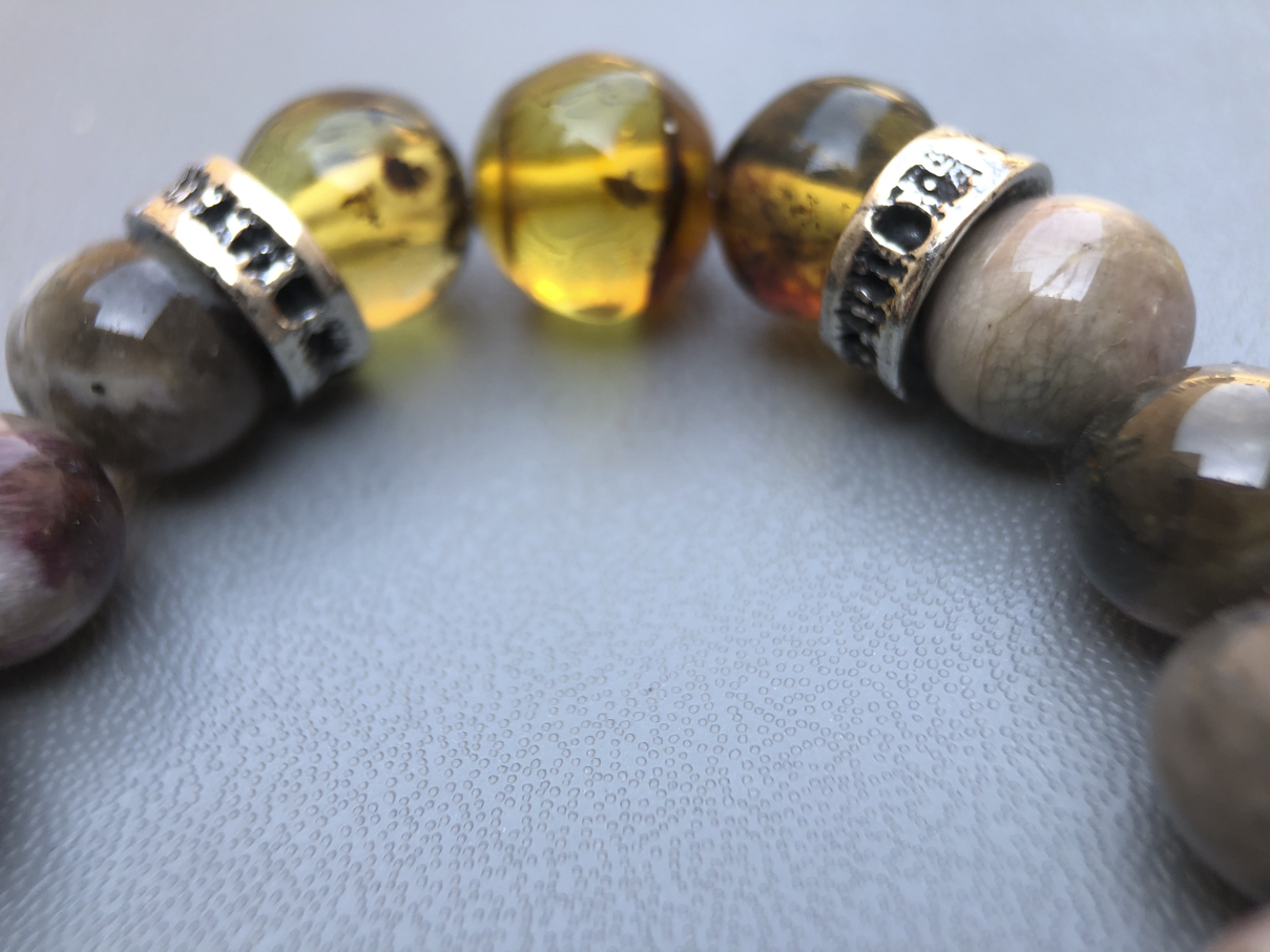 Tipo: Brazalete de Poder. Material: Turmalina, ámbar, y separadores y quinto en plata .925. Peso: 27 grs. / .9 oz. Medida: Personalizable.